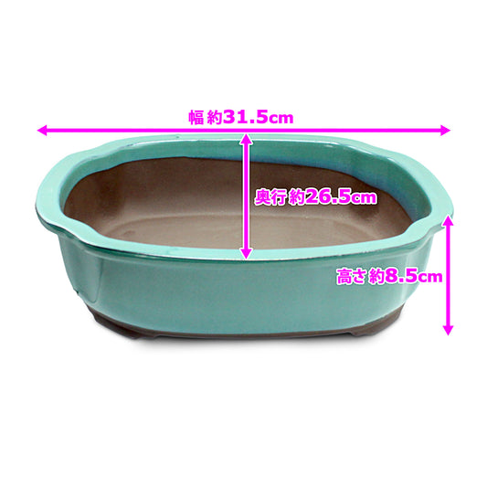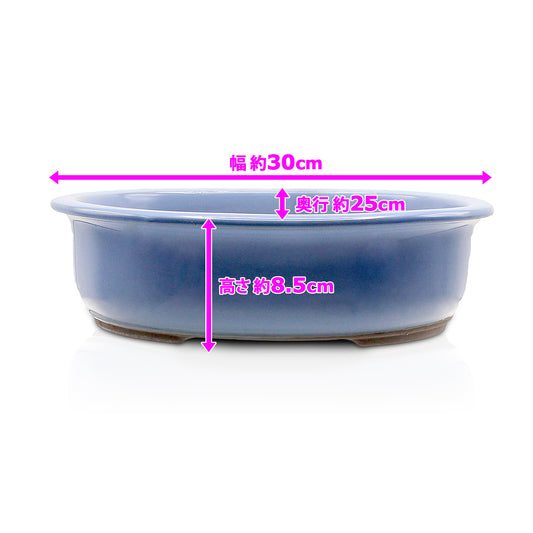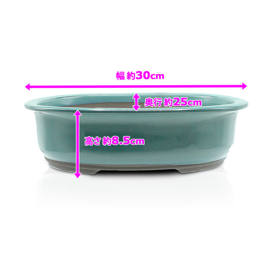 盆栽鉢 10号 オカメ小判 青色 海鼠釉 瀬戸焼 陶器 浅め 山野草 雑木 松柏 大型 中型 約31センチ
