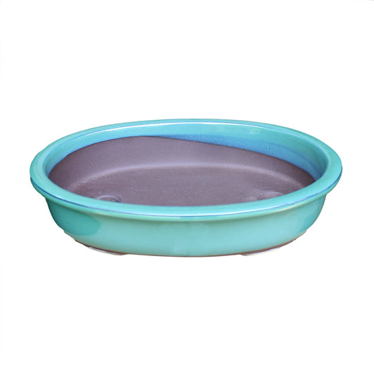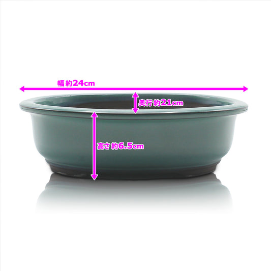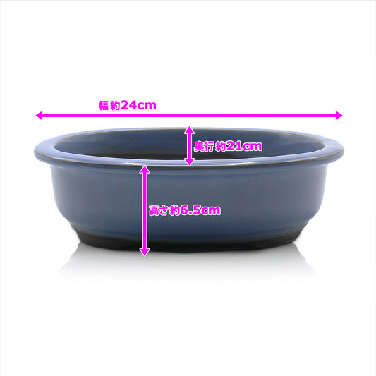 盆栽鉢 8号 オカメ小判 青色 海鼠釉 瀬戸焼 陶器 浅め 山野草 雑木 松柏 大型 中型 約25センチ