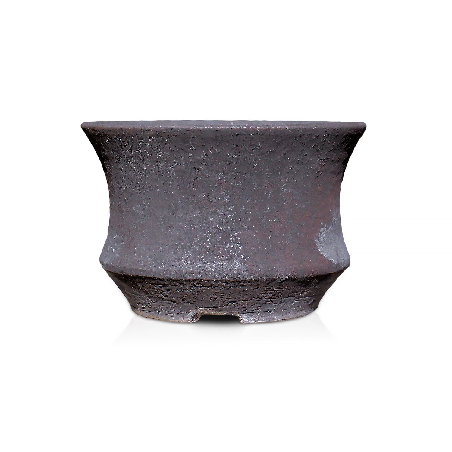 信楽焼に特有の長石の粒が醸す砂気のあるザラザラした土肌に、鉄由来の釉薬によるマットな質感が加えられた鉢です。