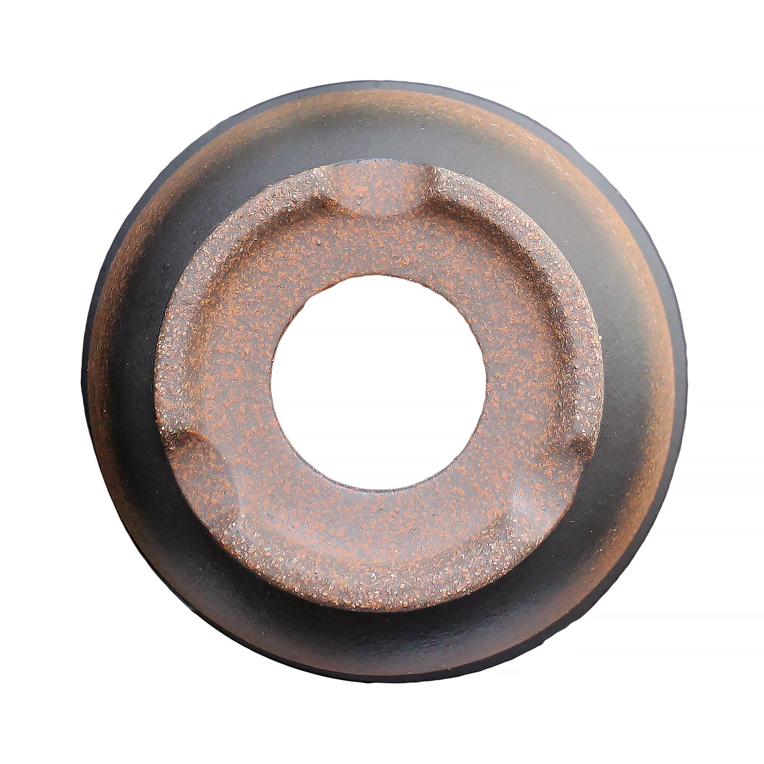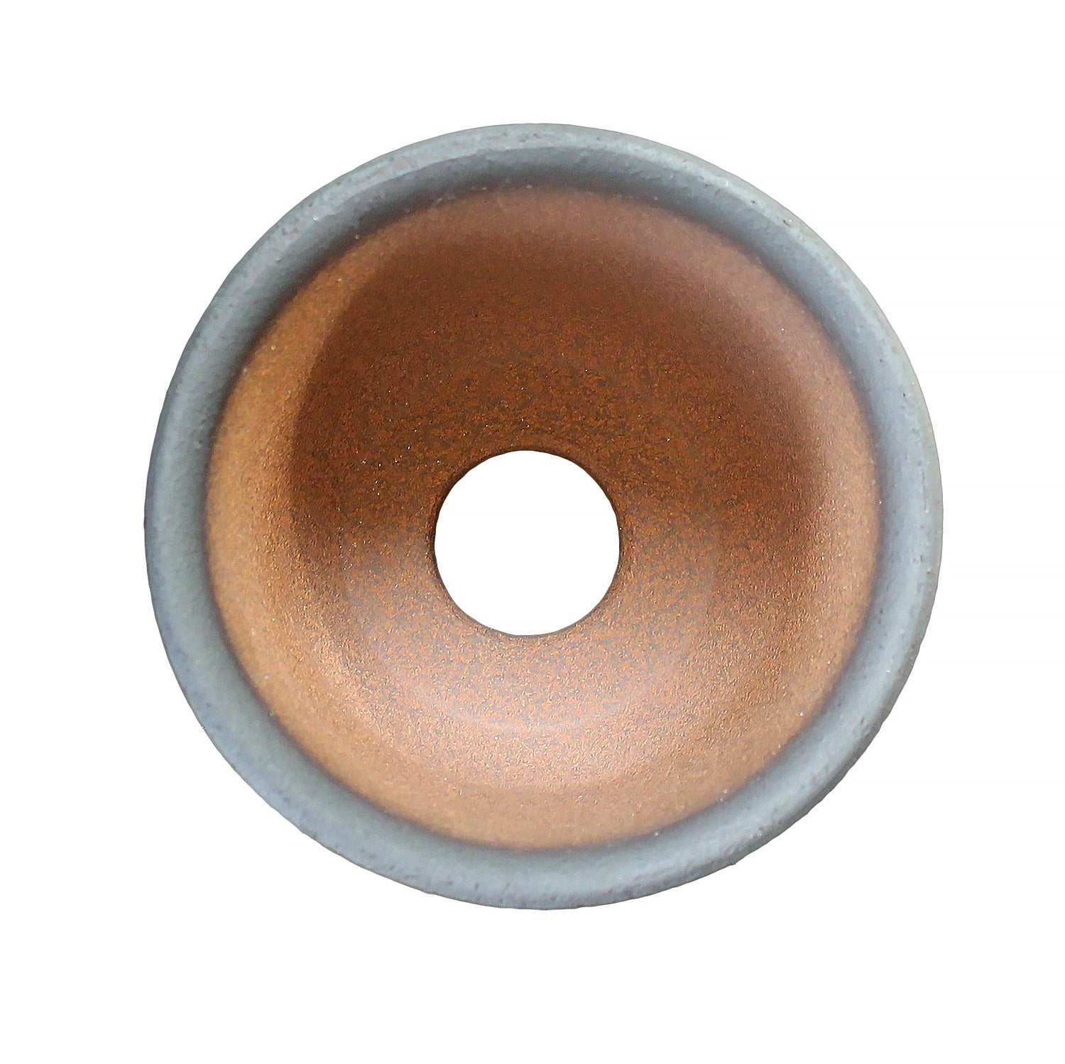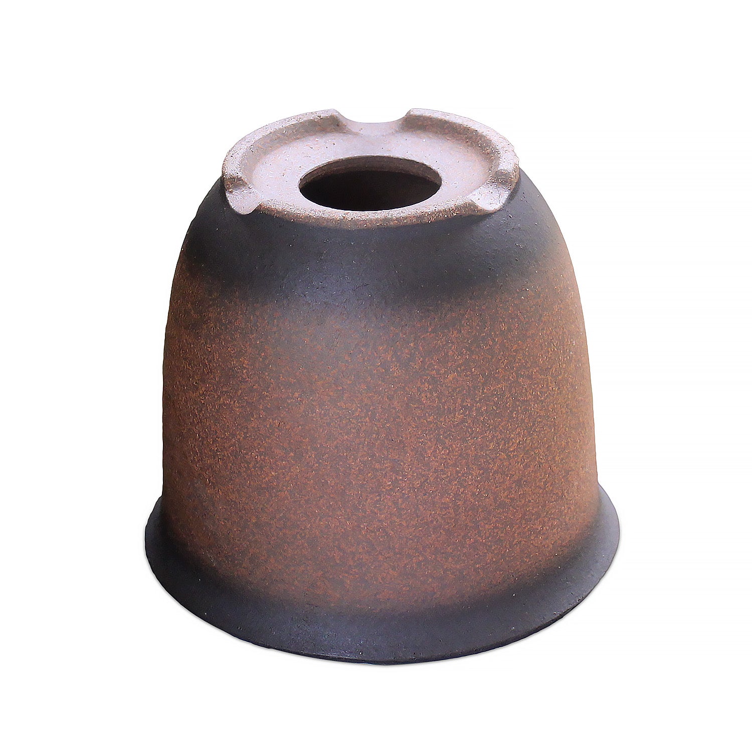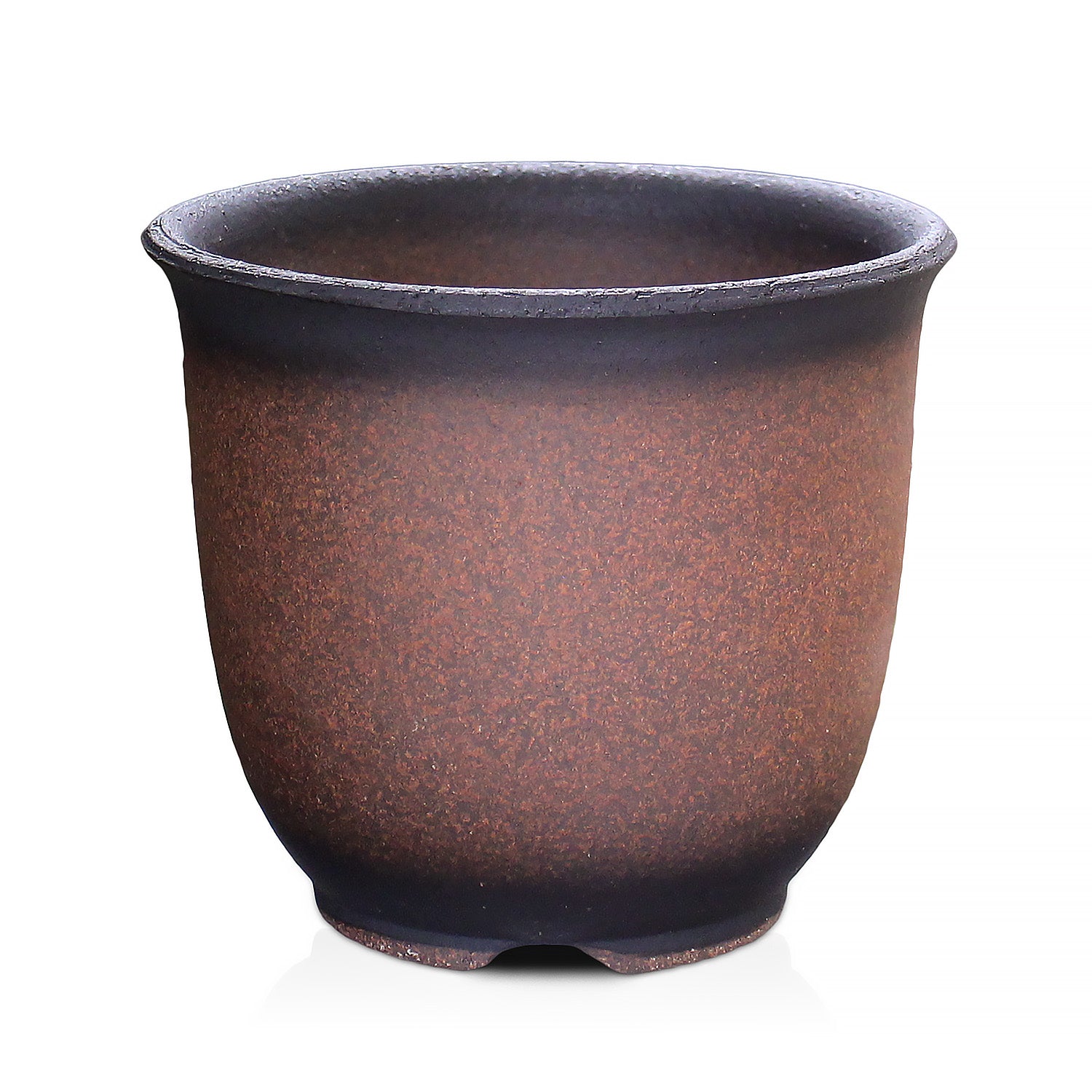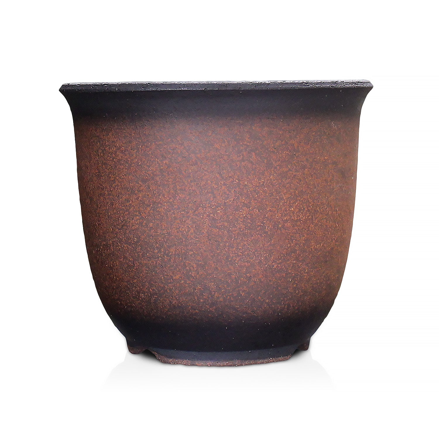 三重県四日市市の萬古焼で、足元と口縁に黒い色の変化がある素朴な趣きの鉢です。褐色でザラザラした風合いの鉢肌で「黒吹」のカラーです。