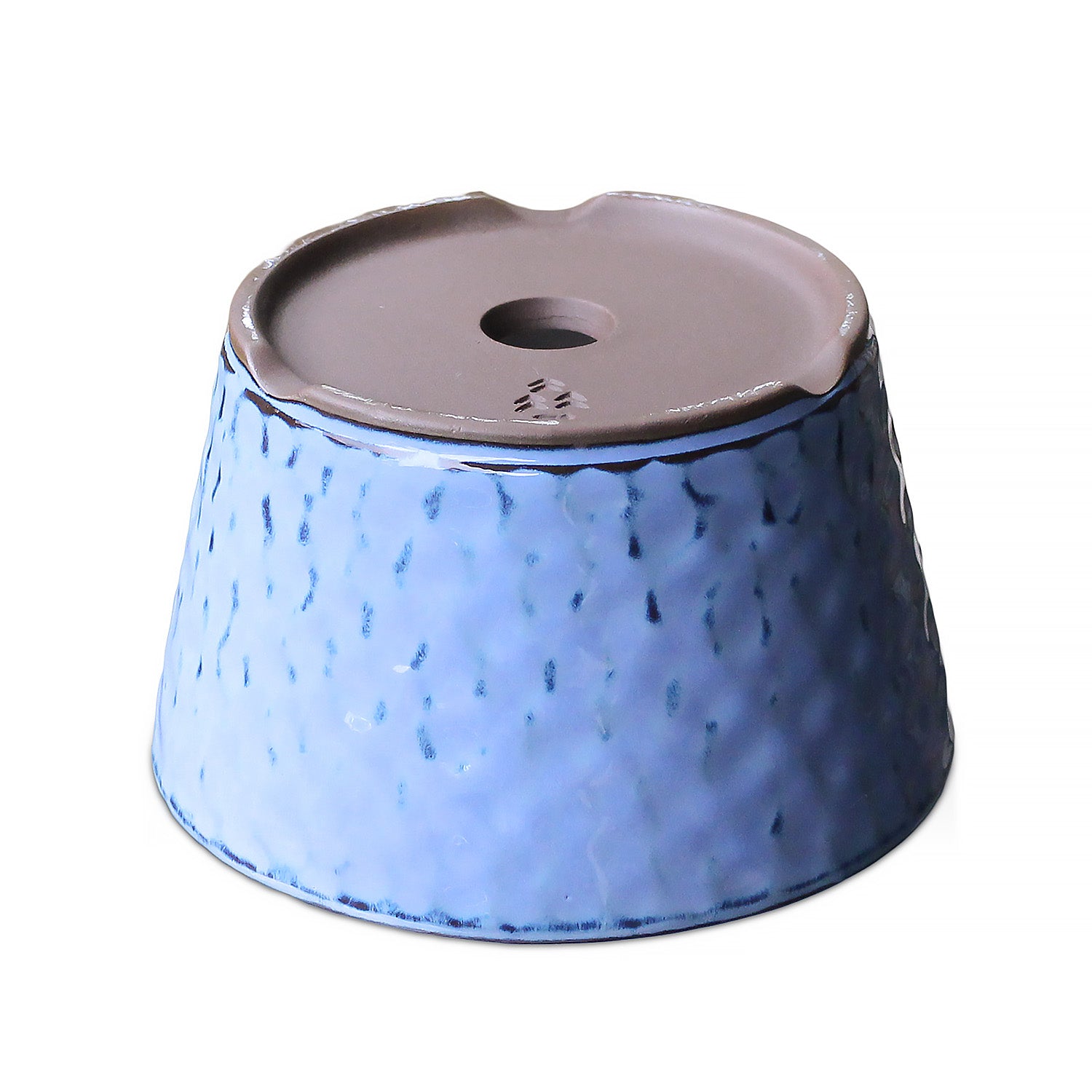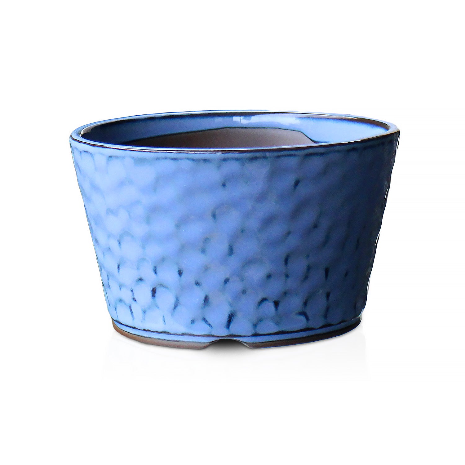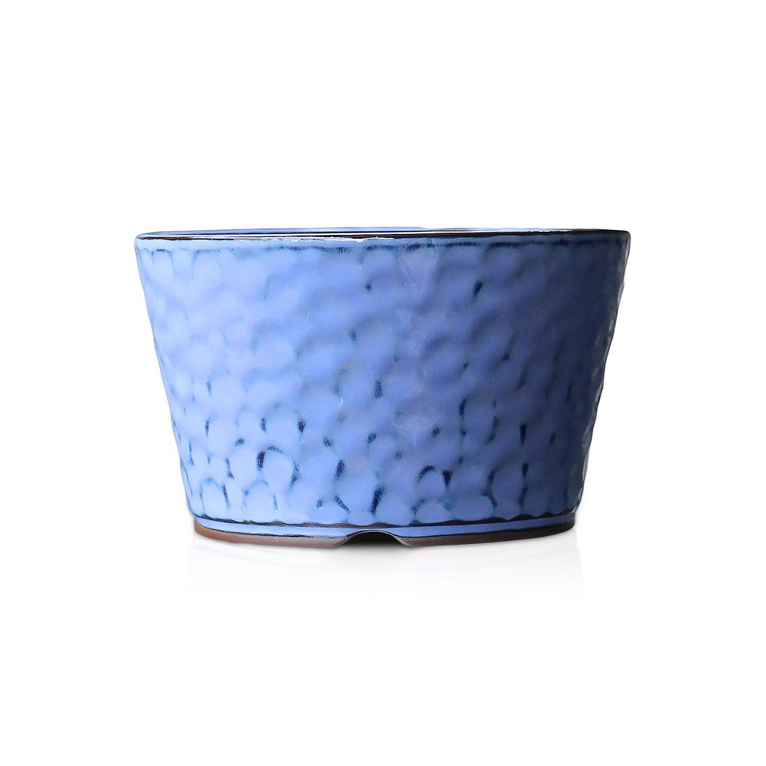 水色で光沢のある綺麗な鉢です。趣きのある肌の質感が印象的です。